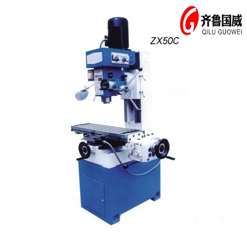 zx50c钻铣床(齿轮传动)本机床为多功能钻铣床,立铣为齿轮传动,加工效率高装有机械进给器,可实现工作台纵向自动进给,减少了劳动强度,提高了加工精度和表面光洁度.床身导轨淬火处理,有良好的耐磨能力。